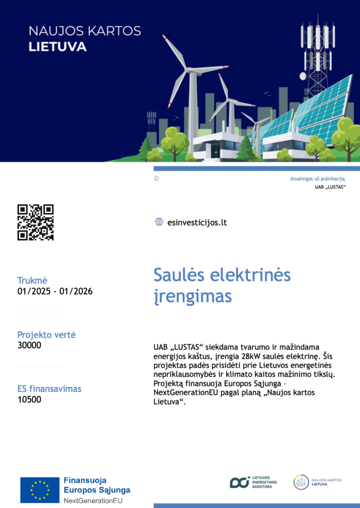UAB „LUSTAS”, siekdama tvarumo ir mažindama energijos kaštus, įrengia 28kW saulės elektrinę. Šis